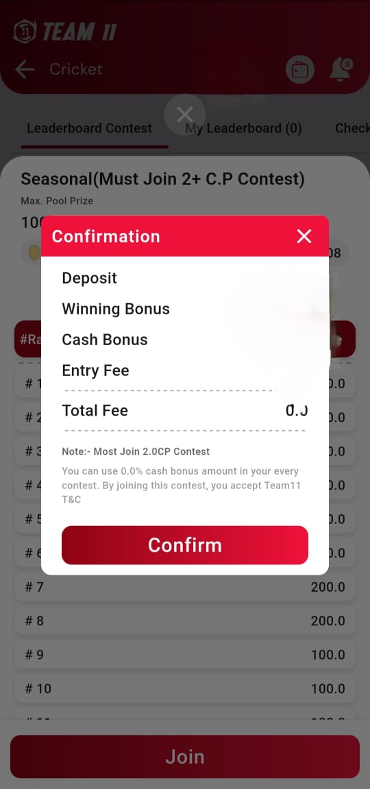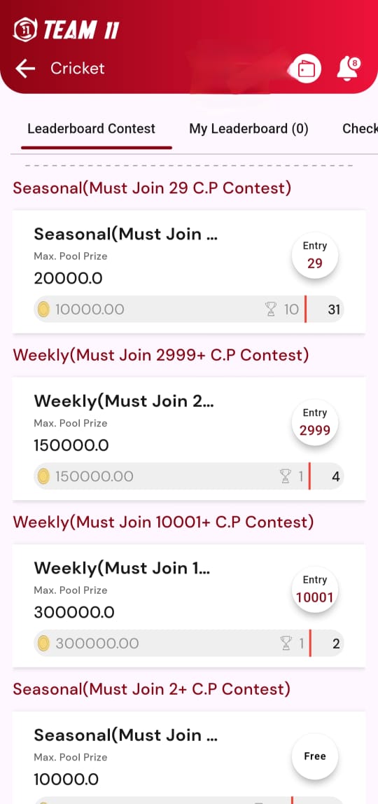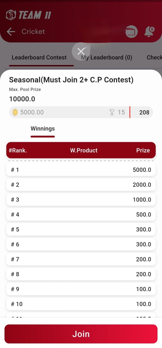 - यदि तपाईंले Weekly Leaderboard मा 150 Credit Point (C.P.) को Leaderboard contest मा Join गर्नुभएको छ भने, तपाईंले Cricket section मा दैनिक BBL म्याचहरूमा 200 Credit Point (C.P.) वा त्यो भन्दा बढी C.P. को contest मा join गर्नु पर्ने हुन्छ ।