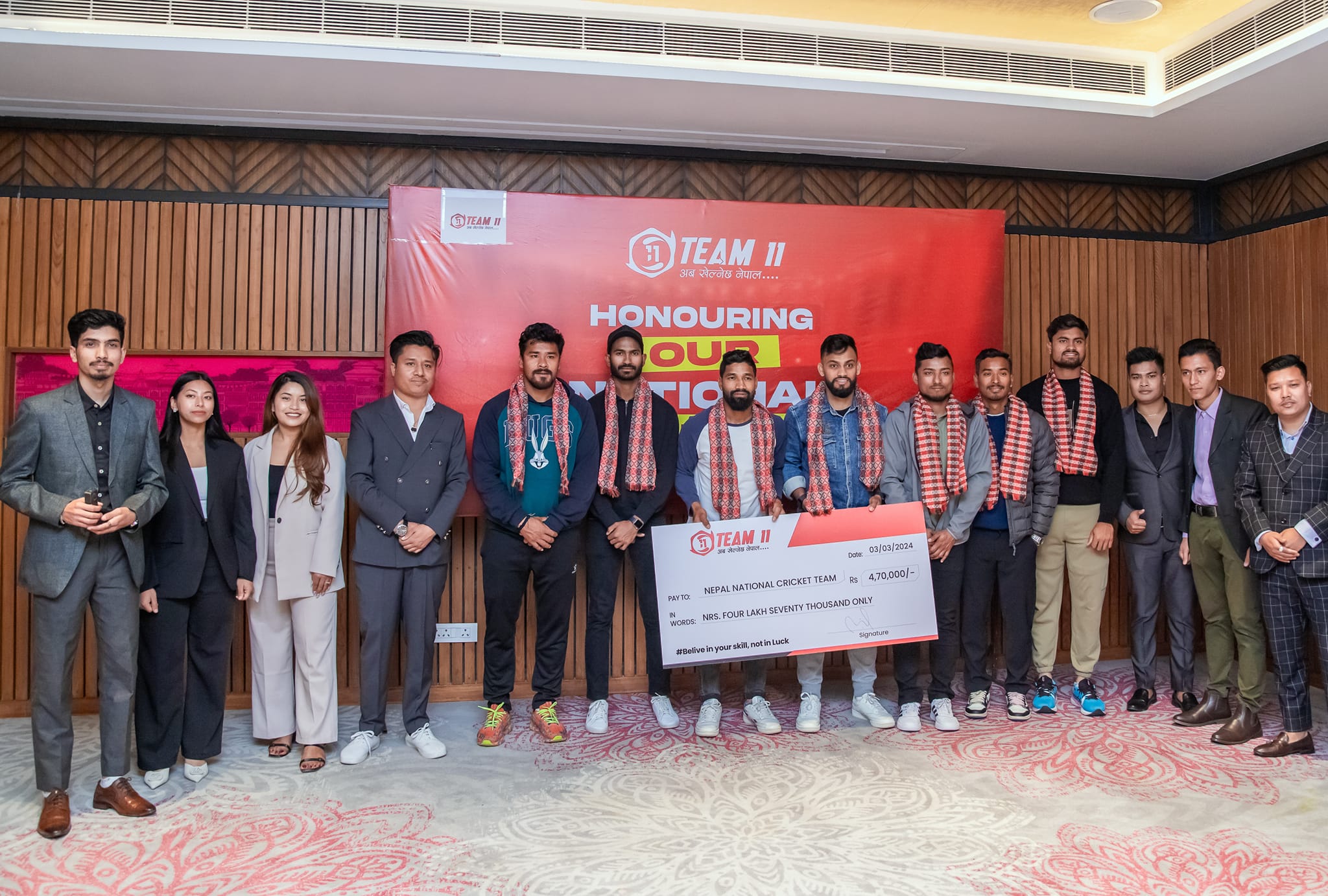 Nepal's first fantasy app, ‘Team 11’ gives tribute to the National cricket players for their magnificent performance in the Asian Games, 2023 between Nepal and India. The program was held on the 3rd of March, Sunday at Hyatt Residence Kathmandu where players and head coach Monti Desai were invited to appreciate their world-class performance by distributing gifts, certificates, and tokens of love. As announced by Team 11, players who take per wickets get 20,000 and those who hit per boundary and six get ten 10,000 and 20,000 respectively. Karan Kc, Dipendra Singh Airee, Kushal Malla, Kushal Bhurtel, Sundeep Jora, Sompal Kami, Gulshan Jha, and Aasif Sheikh are the players who enlist their names for prizes list.