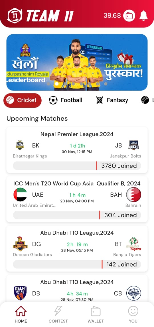 - यदि तपाईंले Free Leaderboard Challenge मा join गर्नुभएको छ भने, Cricket section मा दैनिक NPL म्याचहरू को free contests मा भाग लिनुहोस्।